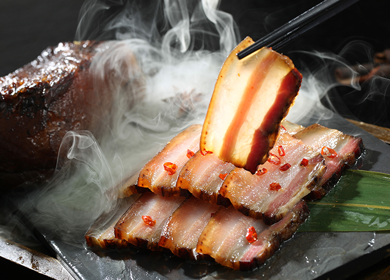猪肉经过15天,充分与空气、温度、水分磨合,在时间这位神奇匠人手中完成最终的华丽变身,香气浓郁五花透影,肉身干爽又富有弹性。纯手工熏制的腊肉有着工业化生产的腊肉所没有的腌腊之香,并因其独特的制作工艺,咬上一口满齿特有的茶香与肉香完美结合,在口中变化着无与伦比的美妙口感,清爽而富有嚼劲。