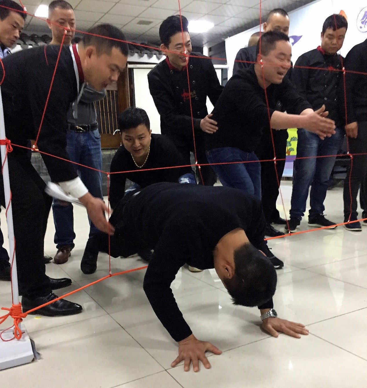 列队整齐的主厨们了解活动的道具,听过活动规则介绍后,开始了刺激而热闹的穿越电网。在比拼过程中,各队发挥着他们的特长,以多种多样的姿势在团队共同努力下穿越障碍到达终点。胜负已不是各队关注的重点,看那热闹的活动现场,看到其他队员也参与进来,相互帮助,活动的过程中队员之间、队伍之间默契合作,彼此信任这才是阿瓦人的作风!他们是可以将脊背彼此交付的战友!