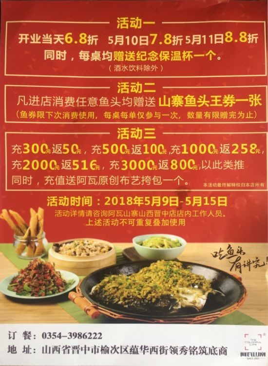 山西晋中阿瓦山寨2018年5月9日—5月15日开业期间好礼不停送更多优惠,更多美食欢迎到店品尝!期待您的到来!