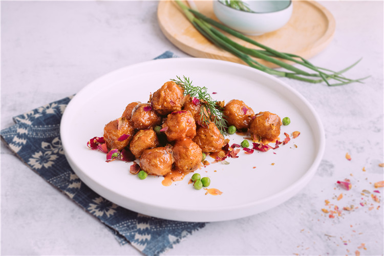 藕丸的做法可谓是丰富,或油炸、或清蒸,各有风味。本季春夏新品的这道『玫瑰藕丸』,咬一口,馅料爽脆,虽经过油炸,但外表被浓郁酱汁包裹,怎么都吃不腻,两口一个,一盘子很快便见底了。