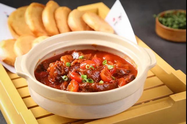 烂汤汁浓郁,再裹上一层炒化的西红柿,让汁水浸入到肉纹里,香