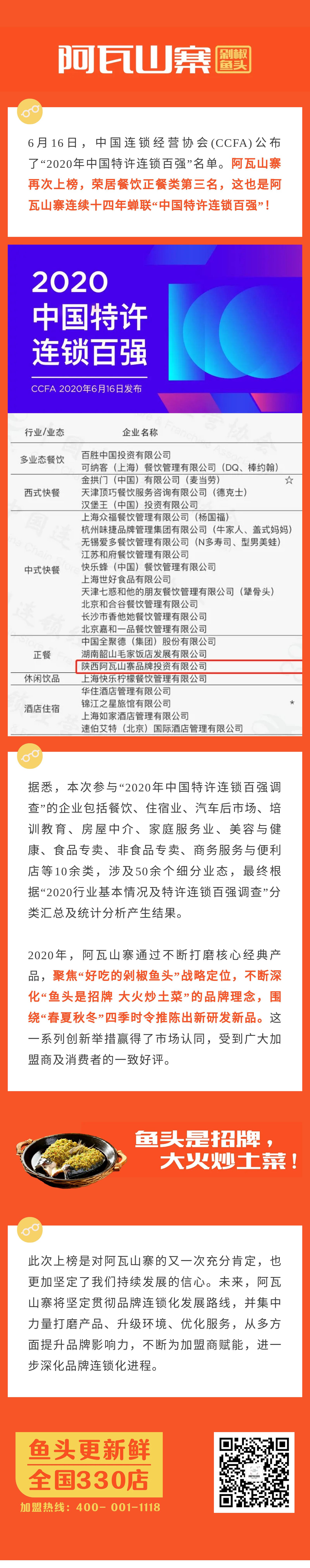 再次上榜!阿瓦山寨连续14年蝉联“中国特许连锁百强”!