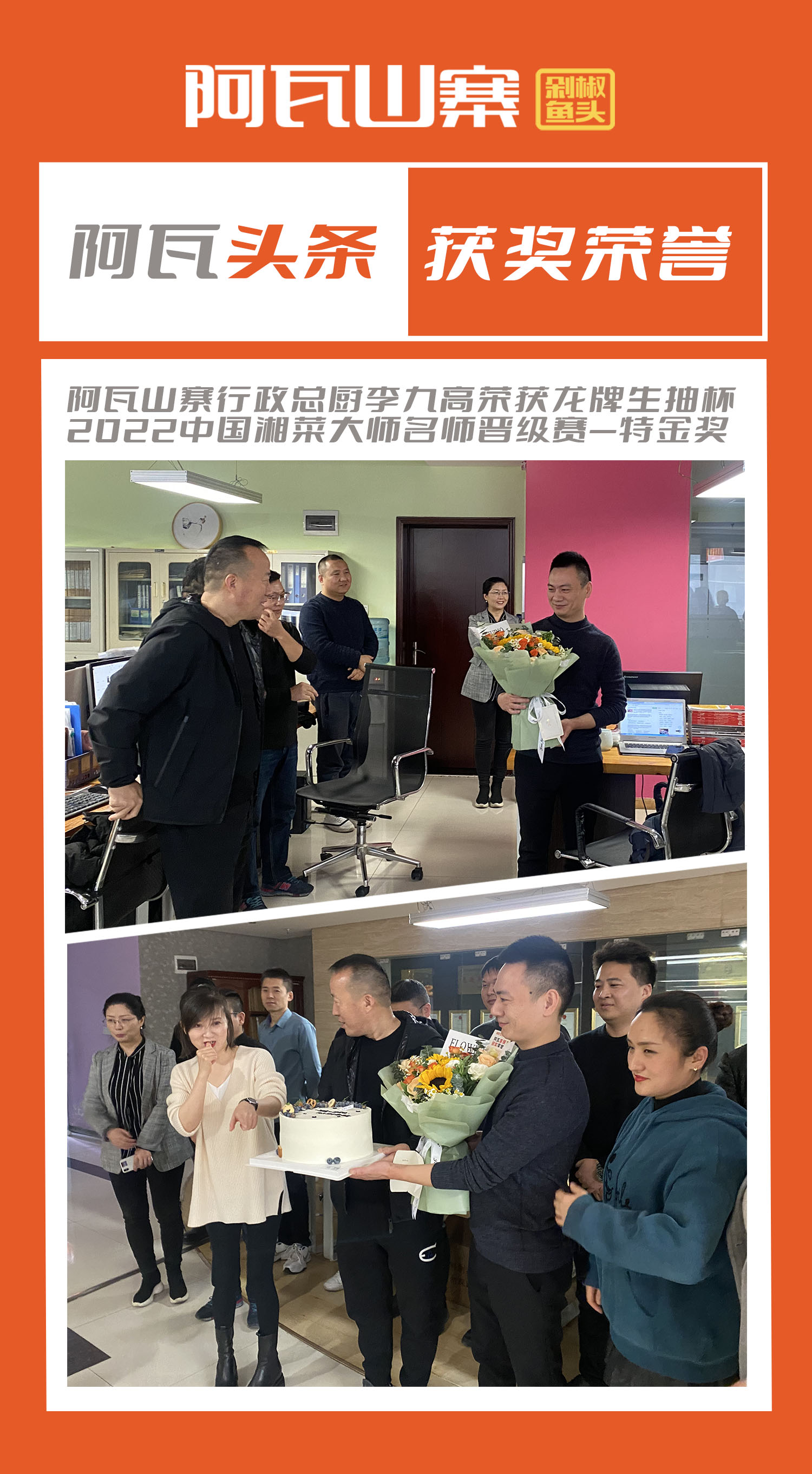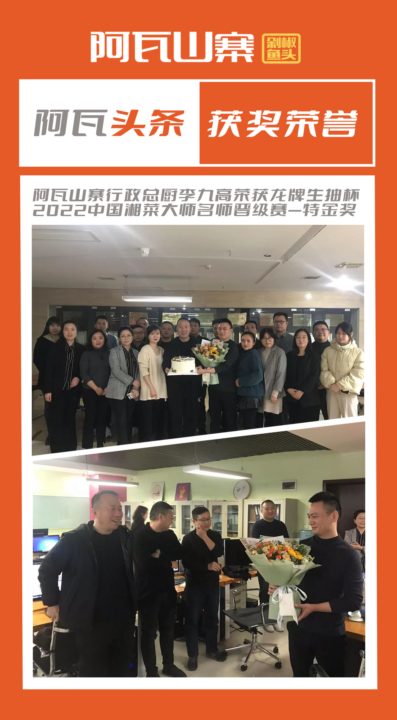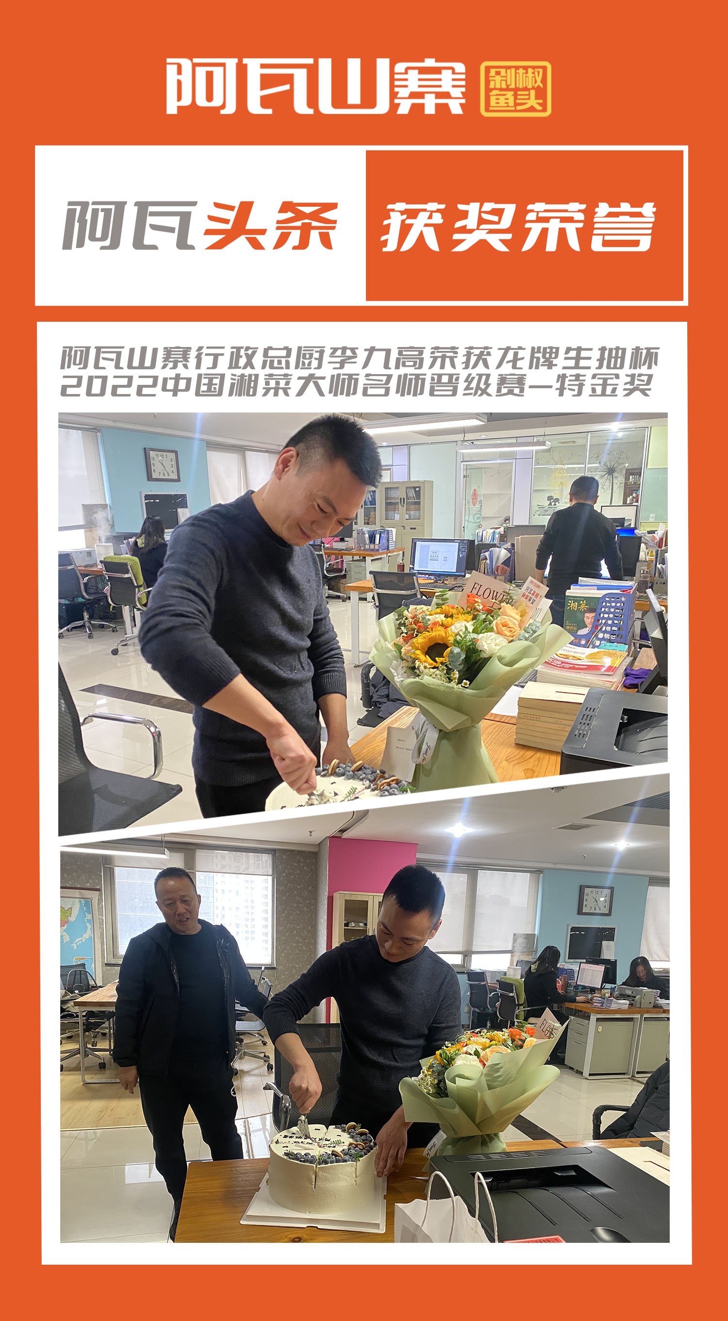阿瓦山寨大家庭庆祝行政总厨李九高荣获龙牌生抽杯·2022中国湘菜大师名师晋级赛-特金奖